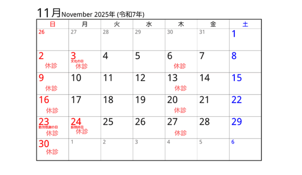 11月の休診日 2025.10.05 Tweet Share Pocket Pin it 記事のタイトルとURLをコピーする ※毎週火曜日の午後は病院勤務のため午前中のみの治療となります Tweet Share Pocket Pin it 10月の休診日 前の記事