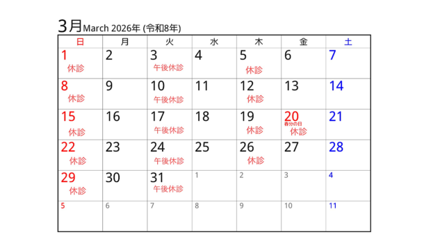 3月の休診 2026.02.27 Tweet Share Pocket Pin it 記事のタイトルとURLをコピーする ※毎週火曜日の午後は病院勤務のため午前中のみの治療となります Tweet Share Pocket Pin it 2月の休診 前の記事